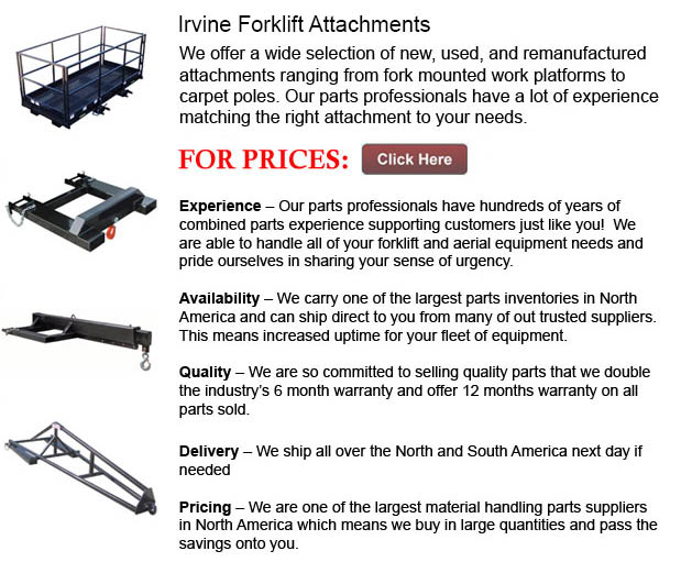 Irvine Forklift Attachments - Irvine is located within the heart of Orange County. It encompasses a total of 45 square miles and was just annexed with the former El Toro Marine Corps Air State and an undeveloped area in the now-northern part of the city. Although the cities official incorporation was on December 28 the year 1971, it has mainly been developed by the Irvine Company ever since the 1960's. The city presently hosts a population of approximately 217,686.